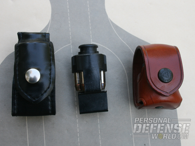 Back when the earth was flat and revolvers ruled, I was introduced to the 2x2x2 pouch and my ancient Bucheimer copy served me well for years. I now utilize a 2x2x2 pouch from Galco to fill that same role. As the name implies, cartridges are held in separate compartments and plucked out and loaded two at a time. A couple of years ago, I attended the Defensive Revolver class at the Gunsite Academy, and a couple hundred tactical reloads later, I was once again thoroughly acquainted with the 2x2x2 pouch.