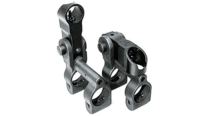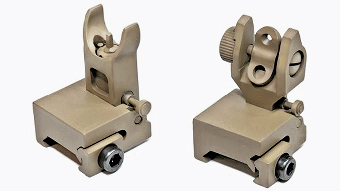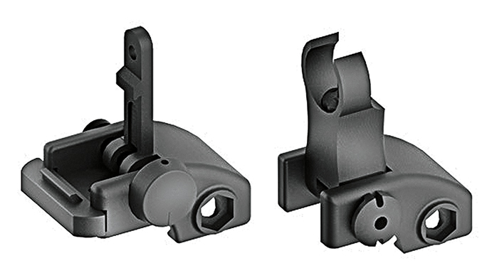 This front and rear sight pair offer a low profile in the folded position. The sights are spring loaded and held in place by a quick-release lever that also ensures the sights are not accidentally deployed. These sights lean slightly to the rear, so they fold back in the correct position if accidentally dropped. The rear sight has dual apertures for different engagement distances. (armsmounts.com; 508-584-7816)