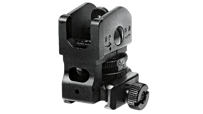 with a matte black finish, the rear sight offers a spring-loaded detent for positioning and repeatable adjustments. The sight is the exact height required for co-witnessing with a standard mil-spec-style front sight. (leapers.com; 734-542-1500)