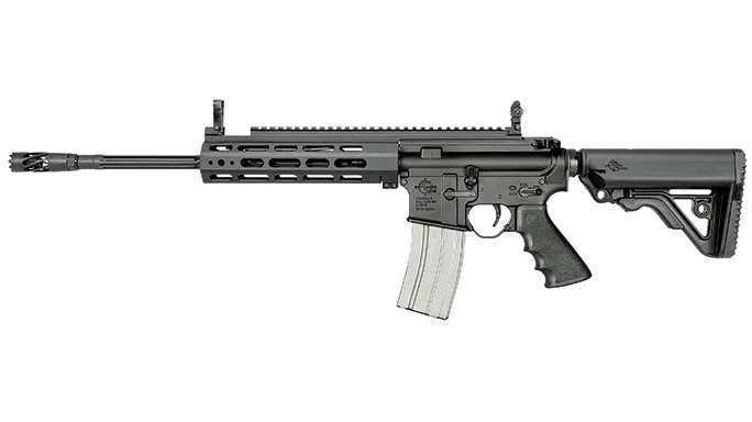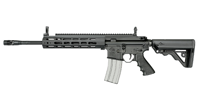 For those who want the performance of the .458 SOCOM cartridge, the LAR-458 series has three models: the CAR A4, the Tactical Carbine and the Beast. Each has a 16-inch, free-floated barrel but different stocks, handguards and muzzle devices. The CAR A4 has a fixed stock, an aluminum tubular handguard and A2-style flash suppressor, while the Tactical Carbine has an extended handguard with short rails on the sides and a full-length rail on top, a Hogue rubber grip and a muzzle brake to control recoil. The Beast is configured with a different collapsible buttstock, a full-length handguard and a tactical muzzle brake.