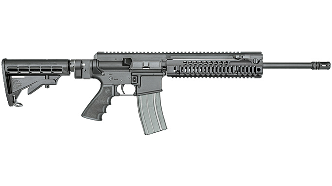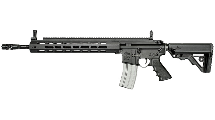Rock River’s IRS rifles use the same low-profile gas blocks, Operator CAR adjustable buttstocks and Hogue rubber pistol grips. The Operator stock is Rock River Arms’ own design that uses a commercial-diameter (slightly larger than mil-spec) buffer tube. The CAR stock has multiple features, including six-position adjustment, a sliding buttplate for effectively raising the cheekpiece height to better align the shooter’s eye with an optical sight, battery stowage compartments and two sockets for quick-detach sling swivels. Each IRS rifle has a 1-MOA accuracy guarantee for a three-shot group using match ammo and a capable shooter.