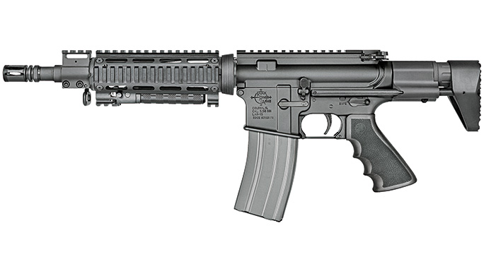 The PDW is 2.5 inches shorter than comparably barreled SBRs because it uses a two-position NEAG CCS buttstock and a shortened bolt carrier to reduce the buffer length. The stock uses two steel rods that align alongside the receiver when collapsed.