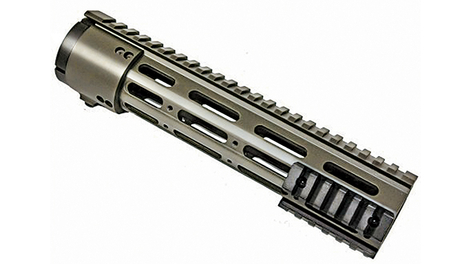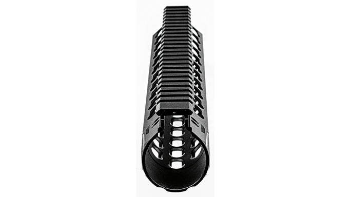 Guntec Thin Profile Handguard: The free-floating, lightweight Thin Profile Handguard from Guntec USA has removable side and bottom rails and is made from light T6 aluminum. The top features a long monolithic rail, and the modular sectional rails are designed to be moved and attached to different positions on the handguard. Available in black and dark earth Cerakote finishes.