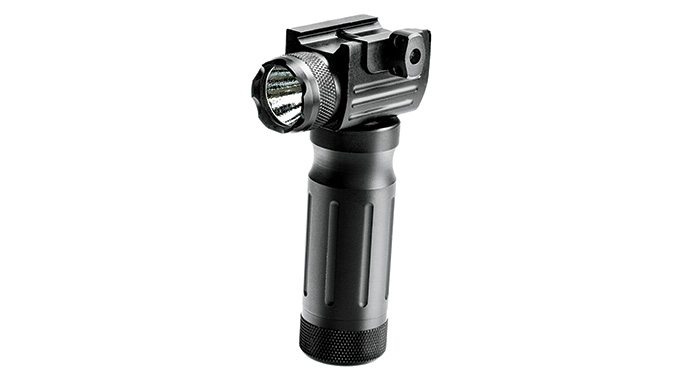 Sun Optics USA Tactical Grip with Red Laser and White Light: This vertical grip from Sun Optics offers users a 250-lumen LED white light and a red laser. With the touch of a button, the two-stage laser can go from constant to strobe mode. The laser is also adjustable for windage and elevation. The unit mounts to any Picatinny-style rail and runs on two CR123A batteries.