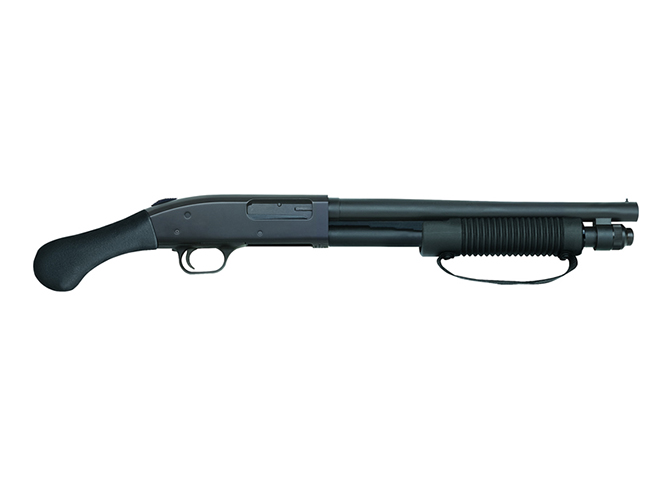 Released earlier this year, the 12-gauge Mossberg Shockwave features a 14-inch barrel and an overall length of 26.5 inches. Classified as a “non-NFA firearm,” it doesn’t require a tax stamp. It also sports non-binding twin action bars; positive steel-to-steel lock-up; an anti-jam elevator; dual extractors; and Mossberg’s ambidextrous top-mounted safety. Also included is a bead sight and a Raptor grip designed by Shockwave Technologies, hence the name. The MSRP on the 6-shot Mossberg Shockwave is $455.