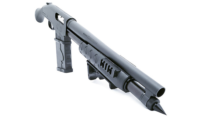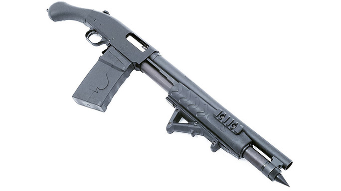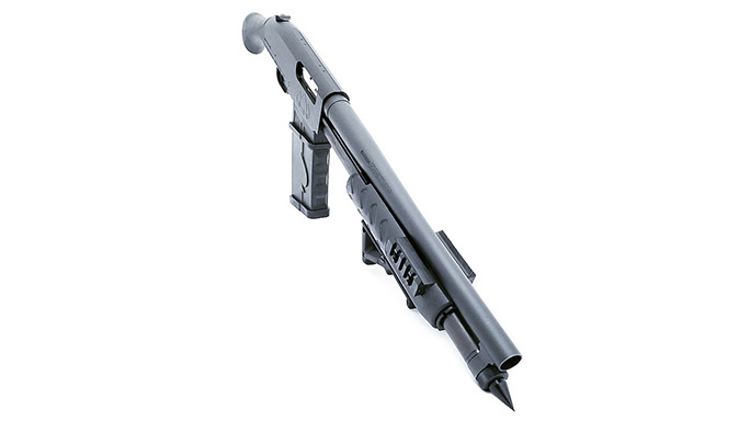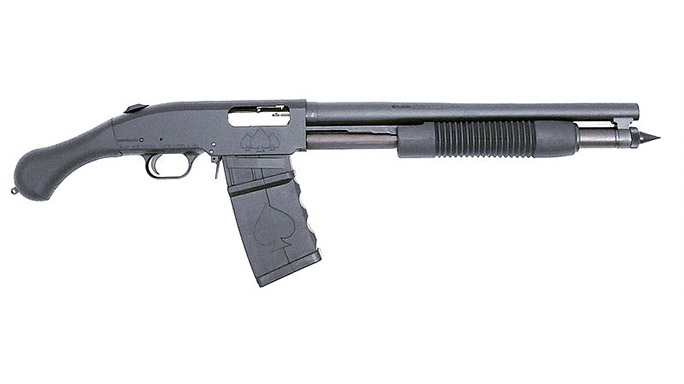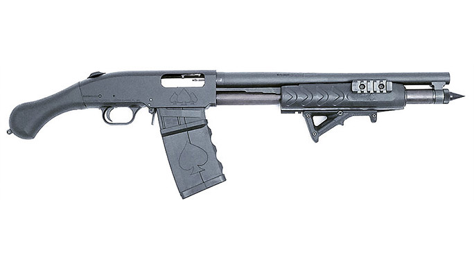 This new model sports that Shockwave pistol grip you’ve come to know and love. In addition, it includes a billet Black Aces Tactical receiver; 4140 nickel plated bolt and slide and 17-4 stainless steel firing pins. The gun comes standard with a Mossberg corncob style forend, but it’s also available with an optional Black Aces Tactical Tri-Rail and Magpul AFG handguard. Another standard feature is a Black Aces Tactical magazine tube spike, giving it that badass look. Each firearm ships out with two five-round stick mags.
