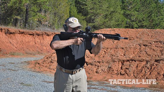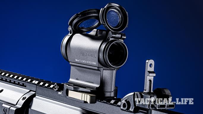 After getting tight 100- and 200-yard groups with a Leupold VX-2 scope in place, the author replaced it with an Aimpoint Micro T-2 for some range drills where the BDR-10 rifle never missed a beat.