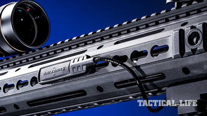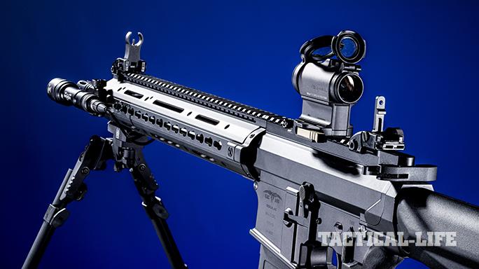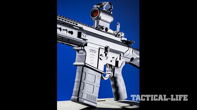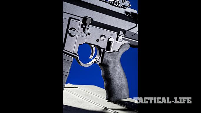 The rifle sports traditional AR-platform controls, but it comes with a comfortable Ergo pistol grip and an enlarged, integral triggerguard housing a crisp ALG QMS trigger.
