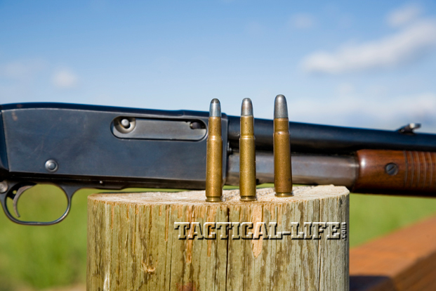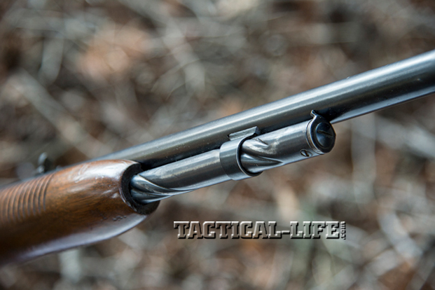 His first iteration came in 1913, when Remington introduced the Model 14 pump- or slide-action rifle. Four chamberings—.25, .30, .32 and .35 Remington—were initially offered. The same case was used, differing only in neck size and some minor shoulder dimensions. A companion rifle Remington christened the 14½ was chambered in a couple of the more popular pistol cartridges of the day, the .38-40 and .44-40 WCF. During the next 23 years, the Models 14 and 14½ were fairly popular, with some 125,020 units finding their way into the hands of hunters. In order to compete with the lever guns, the rifle had to be sleek and light. The Model 14 has three design features that are novel. Its magazine tube has a spiral built into it that prevents the point of one bullet from resting on the primer of the next cartridge. Also, the magazine tube moves fore and aft with the forend during cycling. Lastly, the bolt has a button on its side that releases the bolt so that the magazine may be emptied by cycling the cartridges through the gun.
