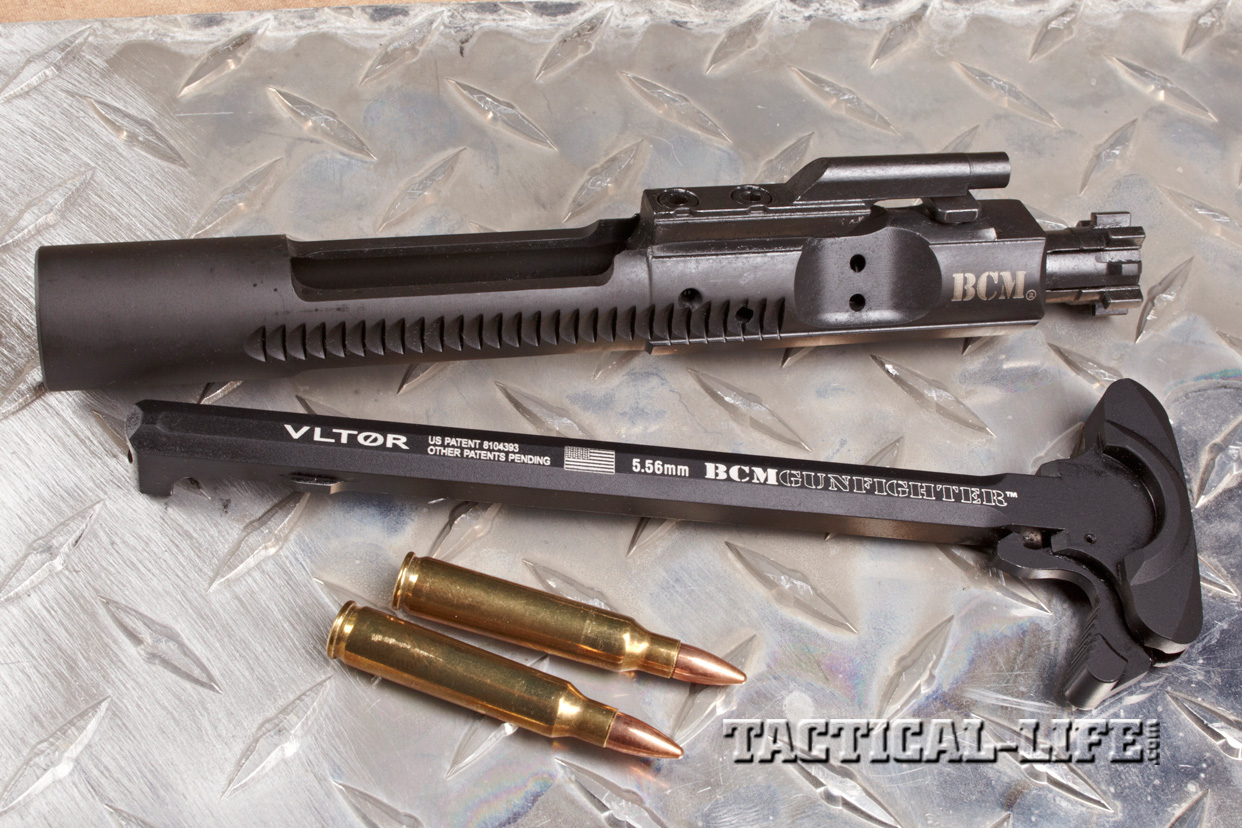 The mil-spec bolt carrier group also uses an M16 chrome-lined carrier, which is stronger and heavier than cheaper commercial bolts and helps to ensure longer and more reliable operation. It should be noted that mil-spec M16 bolt carriers are legal to install in semi-auto rifles. The heavier bolt and heavier buffer work in concert to more securely and aggressively chamber rounds and also reduce the incidence of bolt bounce. Bolt bounce can occur when there is insufficient mass pushing the bolt carrier forward, and as a result, it bounces against the receiver extension before finally closing. This can detrimentally affect function in full-auto guns and during fast firing in semi-auto. To ensure superior reliability, BCM has also improved the extractor, using tool steel for strength and installing its extra-strength extractor spring and insert.