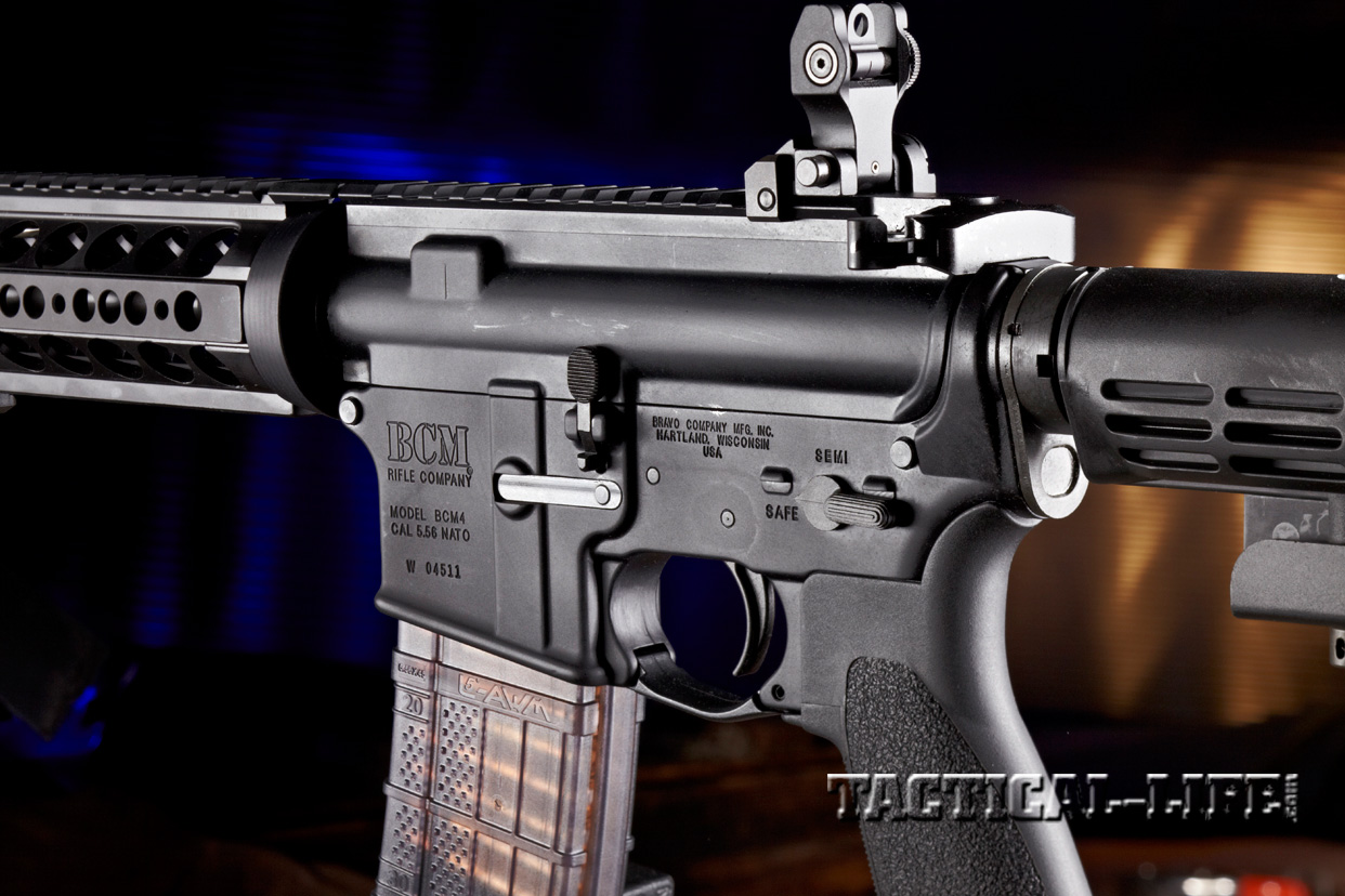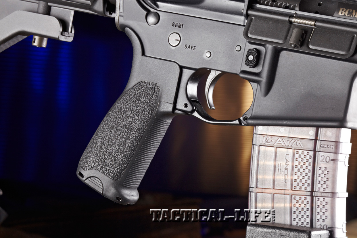 The standard triggerguard has been replaced with an upgraded Magpul MOE enhanced triggerguard, and BCM has also added its own new, ergonomic Gunfighter pistol grip. This grip is a vast improvement over the standard-issue grip and features aggressive stippling on the sides and horizontal grooves on the front. It also has a sizable, watertight storage compartment and is made from tough, impact-resistant polymer.