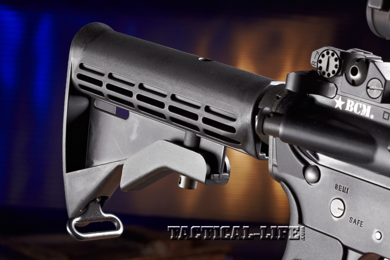 The standard six-position collapsible stock, made of polymer, includes a steel sling-attachment point at the toe and encompasses a mil-spec 7075-T6 buffer tube. The tube is secured with a heavy and stacked M4 lock nut, and inside rides the correct-weight H-marked buffer. Heavier buffers offer distinct advantages, slowing down the bolt and bolt carrier travel to ensure proper case extraction and keeping the internal parts from slamming into each other with as much force. This also reduces the recoil signature.