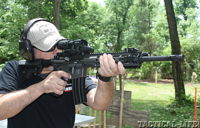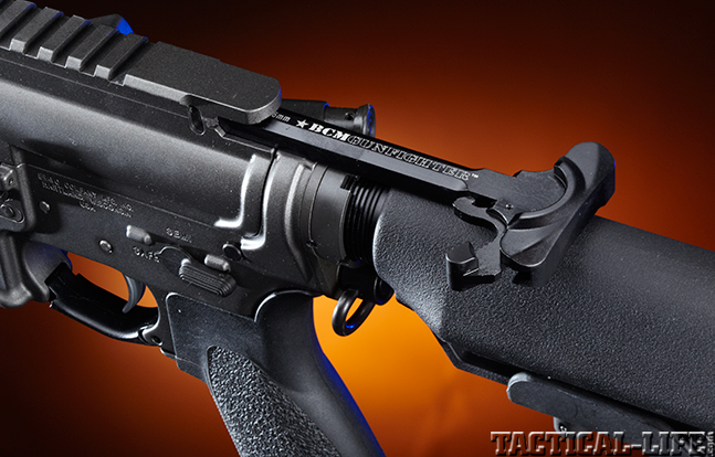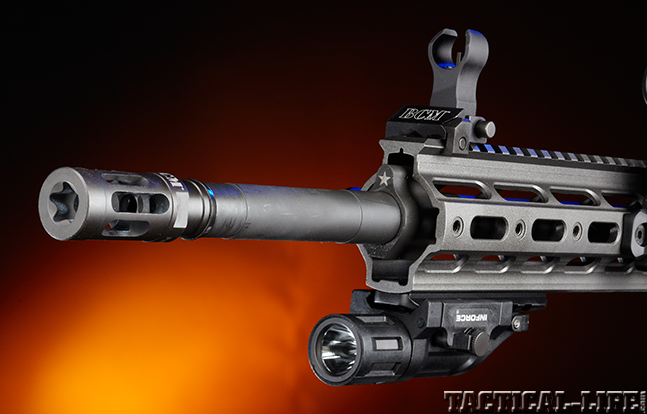 “The 14.5-inch barrel has a 1-in-7-inch twist rate and is made from certified mil-spec 11595E steel with a standard government profile. A BCM Gunfighter compensator is permanently welded to establish a legal minimum 16-inch overall barrel length. This tactical compensator is a marked improvement over the standard A2-style flash suppressor and features tuned slots and interior cones that significantly reduce recoil and muzzle rise while also almost eliminating the rifle’s flash signature. The design also minimizes the usual disruptive-to-team-members side blast produced by most compensators.