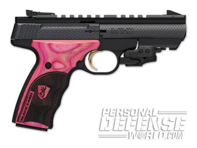 While Browning Buck Mark pistols have been produced for several decades, and made available in many styles, the newest version being introduced for 2015 is a tactical Buck Mark .22 pistol equipped with a Crimson Trace Rail Master®. The Browning Buck Mark Black Label Carbon Fiber has a unique carbon fiber finish, a 4-inch steel barrel and an under barrel accessory rail. The firearms are shipped with a red Crimson Trace Rail Master laser sight pre-installed on that rail.