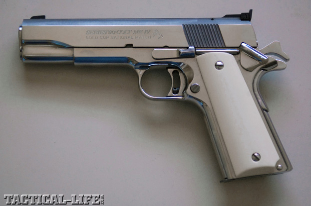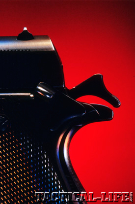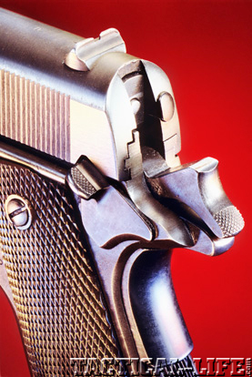 Other minor changes have been better accepted. The crescent relief cuts in the frame just behind the trigger opening give shooters with smaller hands better access for proper trigger press—the cuts do not cause problems for large hands. The shortened trigger has the same goal, although many aftermarket target-type triggers are back to original length. The spur of the grip safety has been lengthened further rearward, to help keep the shooter’s hand safe from hammer bite—on many new custom M1911s, this is extended even further. The hammer spur has also been slightly shortened. The front sight and the rear notch have been widened, a change that’s been made more dramatic on many new custom M1911s or as a retrofit. Finally, the intricate checkering pattern of the wooden grips gave way to synthetic. Custom grips of every conceivable material, texture and configuration are one of the most popular user upgrades.