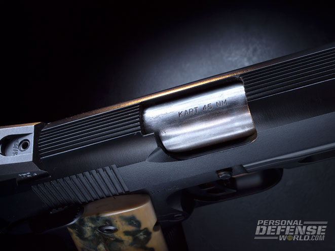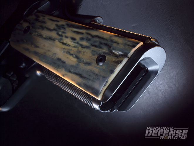 In retrospect, the only change I might have made was an arched mainspring housing for purely ergonomic reasons. But the straight, serrated lines on this pistol contrast nicely with the natural contours of the mammoth ivory grip panels, so it’s only a minor consideration. The only change I made to the setup was highly specific to my preferences; I dressed the slide stop/release to better facilitate assembly and disassembly. Again, this is a non-standard and highly personal change.