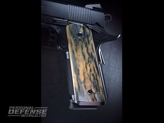 Ultimately, I settled on a SOCOM Blue slide and frame that complemented the mammoth ivory handles I had seen on one of the company’s pistols previously. From a controls standpoint, I opted for the Recon slide with ambi thumb safeties, front cocking serrations, a green rear Novak night sight, a Trijicon HD front sight and a flared mag well.