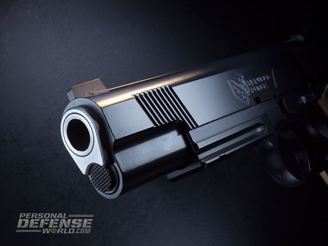 From a finish standpoint, Meister’s fit and finish is commendable and uniform. The slide-to-frame fit is clean and precise. The parts are nicely blended and there are no observable blemishes. The trigger broke cleanly and consistently between 4.25 and 4.5 pounds, exactly where I asked Meister to tune it. The safeties functioned properly and the thumb safety snapped distinctly into both its positions. The front and rear cocking serrations, in my book, are a must for a full-sized 1911, along with 25-lpi front- and backstrap serrations.