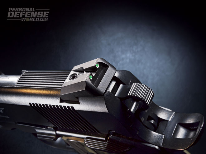 The 1911 came with a Trijicon HD front sight and a serrated slide.