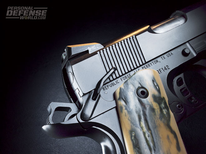 The Republic Forge website directs potential buyers to a “Build Your Own 1911” page where you can begin the process. Starting with a full-sized Stryker standard frame, I began to select options in frame color, slide color, sights and grips. Colors range from Barret Bronze to Tungsten Gray, with unique choices such as Texas Tan and Blue Titanium. You can match the slide, frame and grips, or go for a two- or three-tone look. Grips range from aggressive G10 in a variety of colors to smooth, traditional ivory. Sight options are Novak night sights or Bomar adjustable. Caliber choices include .45 ACP, 9mm, 10mm, .40 S&W and .38 Super. Slide steel options are standard or Damascus, the latter being a particularly distinctive look. Frame modifications include a Recon frame with a light rail or a double-stack mag well, carry cuts, blueing and polish options as well as target sight colors. Control options allow for a choice of a single or ambidextrous safety and cocking serrations.