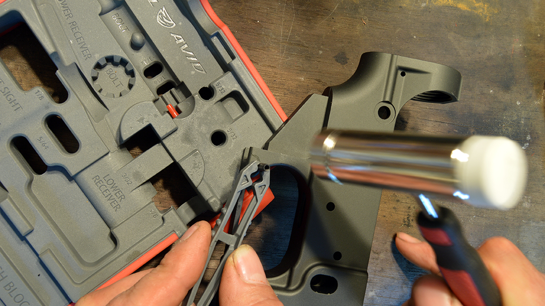 I also tried out some well-thought-out from Real Avid for this build. Useful for any AR build is the Smart-Fit AR-15 Vise Block, which can be tightened in the magazine well to hold any lower still while you work, and the Lug-Lok Vise Block for barrel installation and removal. Instead of gripping the comparatively delicate aluminum upper receiver, the Lug-Lok engages the lugs in the barrel extension to hold it still while you torque the barrel nut down. Very little, if any, twisting stress is put on the upper receiver. The Real Avid AR-15 Master Bench Block is most useful for taking ARs apart, but it’s also great for holding the receiver upright for installation of the bolt-hold-open latch pin and for bracing the front sight base when pinning in the gas tube.