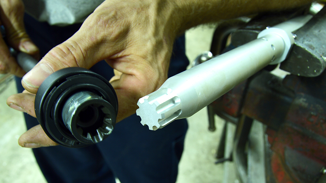 Know these principles to accurately apply torque. 1. Only pull the wrench from the handle (make sure it’s centered on the bar with a manual wrench). 2. Anything that lengthens the handle results in the application of more torque than the wrench is reading, so only mount your barrel wrench at a 90-degree angle from the torque wrench handle. The combined tools make a letter “L.” 3. The barrel nut torque value of 30 to 80 foot-pounds is based on lubricated threads. Because of friction, dry threads will reach the same torque value with less tightening than lubricated ones. If you don’t lubricate the threads and torque to the low end (30 foot-pounds), your barrel nut won’t be tight enough.
