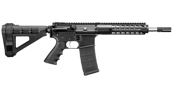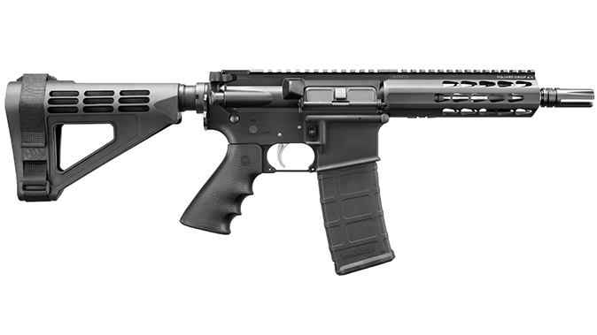 The Bushmaster XM-15 SquareDrop features Advanced Armament Corporation’s SquareDrop modular free float attachment system for accessories, hence the name. It also comes equipped with an SB Tactical arm brace out of the box for the benefit of added stability and improved accuracy, the company says.