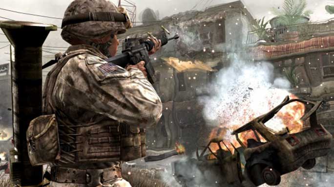The M16A4 is mostly used by U.S. recon Marines. According to IMFDB, it (incorrectly) fires fully automatic in single-player. In multiplayer, it has a three-round burst, which is more accurate. It’s especially effective at long ranges. The M16A4 can be fitted with a silencer, red dot sight, ACOG scope, and M203 grenade launcher in multiplayer. It also has a draw time of 0.35 seconds. As the COD Wiki points out, this means switching to the M16A4 is almost as fast as switching to a handgun, but with more “killing power.” The M16A4 is pictured here in a promotional image during the mission “War Pig.”