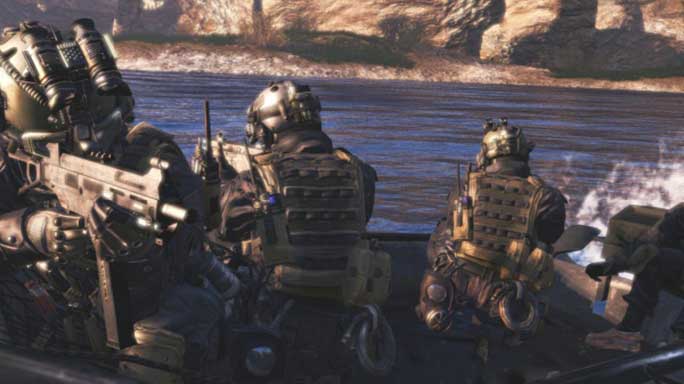 In campaign mode, the ACR 6.8 — a 6.8mm SPC variant of the Remington ACR, the IMFDB says — is a rare weapon only used by Derek “Frost” Westbrook in the mission “Scorched Earth”. In multiplayer, it is unlocked at level 50 and enjoys a relatively high damage per bullet. According to the Call of Duty wiki, the ACR deals 45 damage at any range prior to 20 meters, which means a two or three-shot kill is achievable if one bullet hits the head of an unarmored opponent. It is pictured here being used by a Delta Force soldier with a red dot sight attachment.