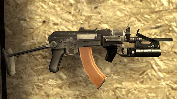 Effective as a close and medium-range weapon, the AK-74u is classified as a submachine gun in COD 4: Modern Warfare, but as IMFDB points out, it penetrates walls and other cover like other assault rifles, something other SMGs in the game can’t do. In campaign mode, this gun is used by the Russian Ultranationalist organization and the Middle Eastern antagonist group OpFor. In multiplayer mode, it can be customized with a red dot sight, silencer and ACOG scope, according to the Call of Duty Wiki. It is pictured here with a grenade launcher attachment.