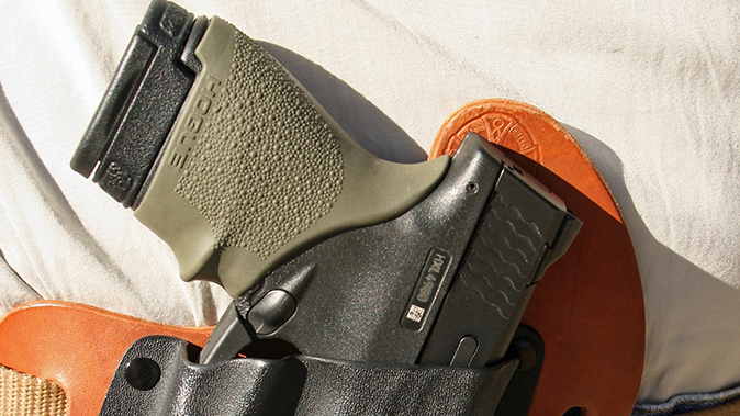 Many of the modern-day semi-autos available today, particularly those with polymer frames, do not come with removable grips; rather, the grips are an integral part of the molded polymer frame. My own S&W Shield 9mm falls into this category. In these cases, your ability to improve your grip is a little more limited than those handguns designed with the typical removable grips. But Hogue has addressed these concerns with its HandAll grip sleeve. These sleeves have been scientifically engineered and designed to conform to the shooter’s hand and the firearm itself in order to improve handling as well as shooting comfort.
