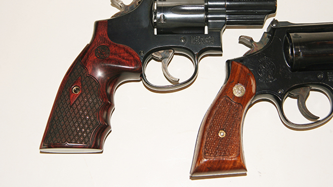 They are available in a variety of appearances, ranging from very fancy to semi-plain, checkered or not. For my own K-Frame S&Ws, I chose a couple of Altamont Bateleur finger-grooved grips: I put a Super Walnut set without checkering on my S&W Model 15 Combat Masterpiece in .38 Special and a textured/checkered Super Rosewood Spanish Diamond set with a laser-inscribed logo on my snub-nose S&W Model 19 in .357 Magnum. I found both grips were superbly well made and very attractive. Both sets were a bit larger than the S&W factory grips that came on those guns, but this provided me with a much steadier hold. The suggested retail prices vary depending upon the design and material used but generally range from about $40 up to $80.