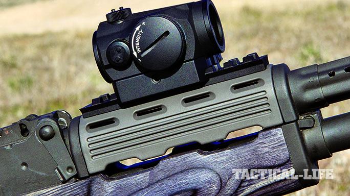 Using full-sized red-dot sights on an AK can be problematic. They sit so high that it’s harder to get a solid cheekweld while aiming. Smaller red dots work nicely, however, and Aimpoint’s Micro T-1 is one of the best out there. It’s small, lightweight and incredibly rugged, with a run time of over 50,000 hours. Mounted to the Strikeforce’s top rail without a riser, the sight sits low enough to allow for a normal cheekweld.