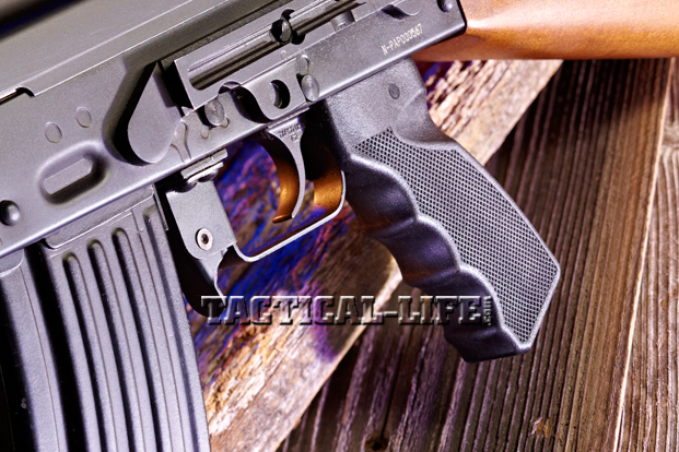 With the N-PAP, Zastava and Century set out to refine the AK-47 platform and address a number of its ergonomic issues. The N-PAP was developed with an eye for quality as well. For example, the N-PAP is not made from parts that were stripped from a surplus gun overseas then cobbled together here. Each and every component—including the hammer-forged, 16.5-inch barrel—is new. Some of the N-PAP’s furniture is inspired by the AKM. For example, the barrel is fitted with an AKM-style, wedge-shaped muzzle brake retained by a plunger. Another AKM-style feature is the arrangement of semicircular vents on the gas block. A one-piece, steel cleaning rod is retained underneath the barrel. A skeletonized front-sight base has curved ears to protect the front-sight post, which is adjustable for elevation and windage. The rear sight consists of a U-notch fixed to a ramp with range call-offs indexed in 100-meter increments out to 1,000 meters. A fixed sling loop is pinned to the left-hand side of the gas block, but mysteriously there is no corresponding sling attachment point on the stock. Overall the stock has more mass than that of a standard AK. The comb is taller and wider as well, so it offers the operator the potential for a better cheekweld. The stock is also fitted with a gently curved recoil pad that conforms to the shape of the shoulder pocket. Sandwiched between the stock and recoil pad is a decorative black spacer. The length of pull measures 13.5 inches, which is significantly longer than a standard AK-style fixed stock. The N-PAP’s forend is made to M70 dimensions, so it’s bulkier than a standard AK as well. Properly sized rails would be required if you wanted to upgrade your gun. I have been told that UTG and other quad-rails made for the Yugo M70 should also fit the N-PAP. The black synthetic pistol grip has three finger grooves on the frontstrap, while the side panels feature molded-in checkering and dished recesses on both sides for the base of the shooter’s thumb. The grip’s ergonomic contours and texture help ensure better control and help the shooter drive the gun.