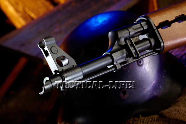 The AK-47 was the ideal service rifle for both the man and the land he defended. Its simple and rugged mechanism included a long-stroke gas-operating system with a piston located above the barrel, a time-tested and well-proven system. The bolt carrier and piston are a one-piece unit. A fixed cam on the bolt rides in a kidney-shaped groove in the underside of the carrier that rotates the bolt in and out of battery. Two horizontally opposed lugs on the bolt body lock up in corresponding locking recesses in a barrel block that is housed in the stamped steel receiver.