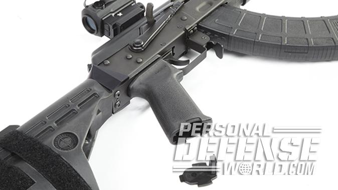 My test RAS47 Pistol came with one of Century Arms’ SB47 stabilizing braces. This flexible rubber support has two Velctro straps and is designed to be attached to a shooter’s arm. If you have never used an arm brace, it feels like a lethal prosthetic. Attaching the arm brace to the RAS47 Pistol was as simple as loosening the pistol grip. With the grip loosened, I slid the brace between the receiver and pistol grip. I then tightened the grip screw, which left the arm brace attached but easily removable. The fit was relatively seamless.