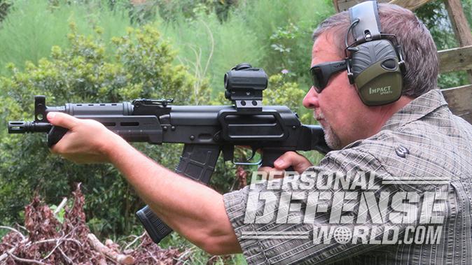 The standard AK-47 slant muzzle brake did a good job controlling muzzle climb, though the 10.6-inch barrel meant there was more muzzle blast. The RAS47 was controllable and effective in rapid fire against targets. It was also easy to maneuver through doorways, getting into and out of a vehicle, down narrow halls and around corners. The RAS47 Pistol is not an SBR by BATFE definition, but it is the closest you can get.