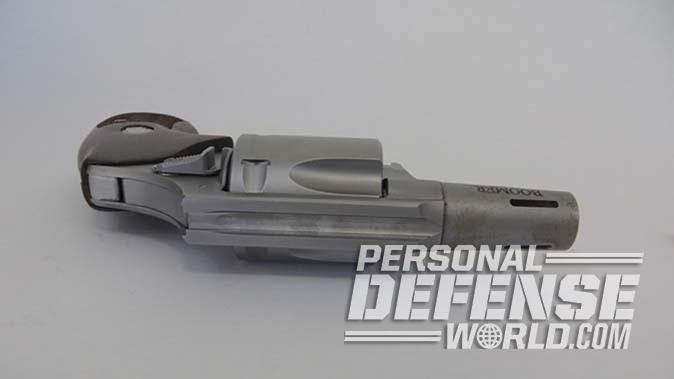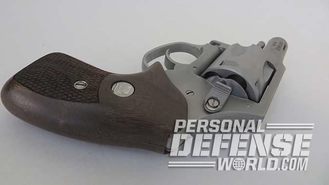 As for sights, you only have a groove running the length of the topstrap. The cylinder latch is coarsely serrated so your thumb does not slip when pressing it forward to swing out the cylinder. The ejector rod is not enclosed in a shroud. An operator can also pull the ejector rod out by pulling on the knurled end of the ejector rod. The rod has a sleeve that snaps into the front of the frame when the cylinder is closed. This locks the front of the cylinder while a pin in the center of the ejector fits into the rear of frame, locking the rear of the cylinder.