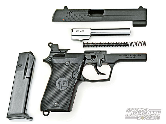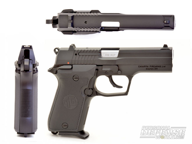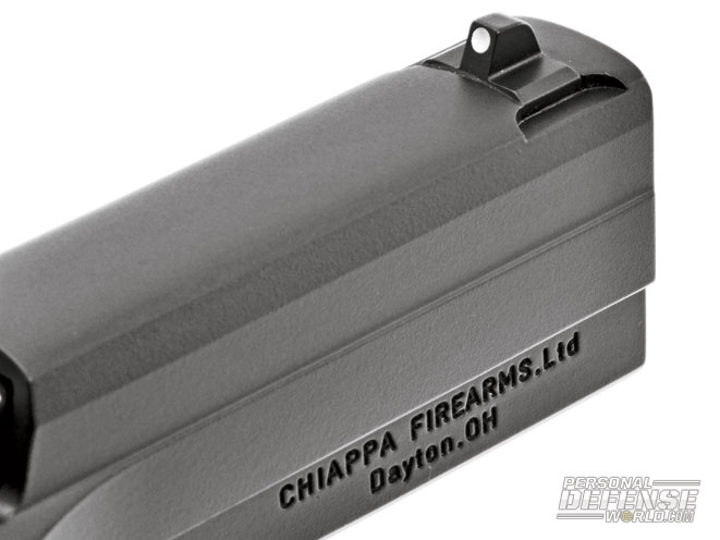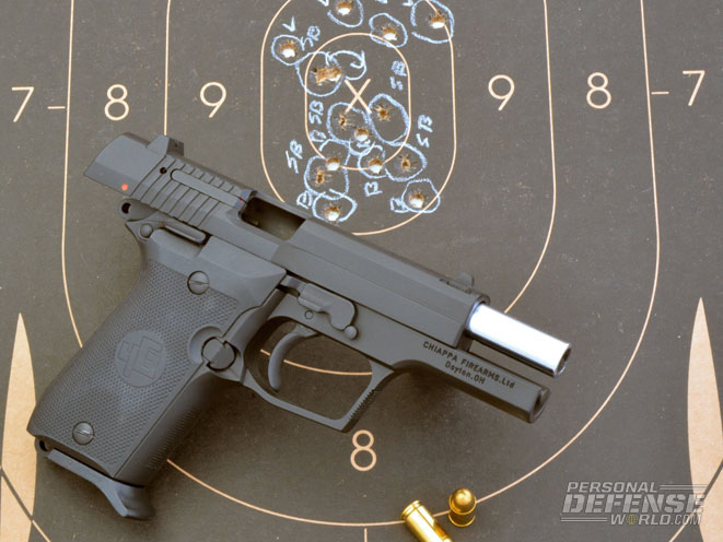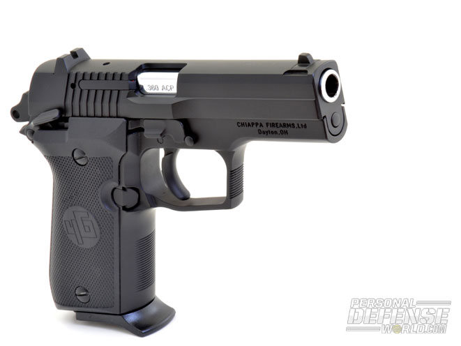 The magazine release is easy to hit and the empty mag drops cleanly. On the reload, the slide release, which is oversized (by .380 standards), makes it easier to thumb down and chamber the first round. It is also in closer proximity to the grips and thumb safety than most, so there is less of a reach. Overall, the Chiappa has a very clean exterior, nicely melded slide and frame contours and a man-sized, whole-hand grip with the little finger supported by the magazine’s floorplate extension.