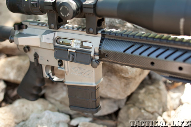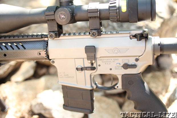 The lower receiver on the Christensen Arms CA-15 gets a few more parts that would be considered upgrades on other AR-type rifles. The magazine release latch is a Wilson Combat model with an oversized release-lever plate. The safety is ambidextrous too. An oversized Magpul triggerguard and a Magpul CTR collapsible stock are also included. The pistol grip is Hogue’s overmolded version. Completing the lower receiver is a Timney 4-pound pull trigger.