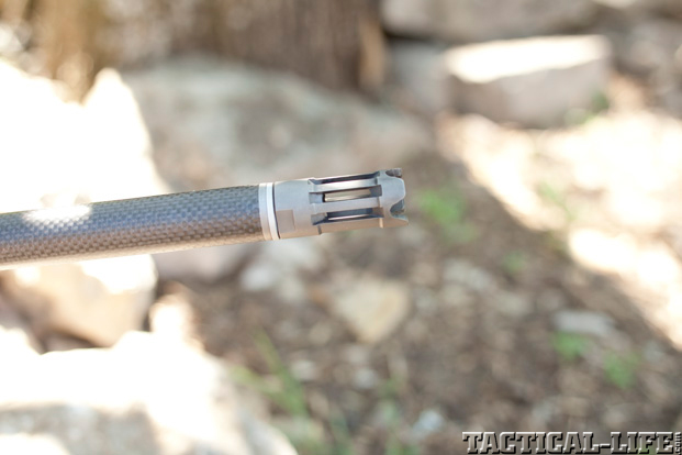 To further reduce weight, this rifle sports an attractive carbon fiber handguard with a full-length Picatinny rail. The bottom of the handguard also sports a molded 5-inch rail on the forward portion that makes a handy attachment point for a bipod. The handguard features diagonal vents as well as four evenly spaced round holes on the sides, which can serve as attachment points for accessory rails.
