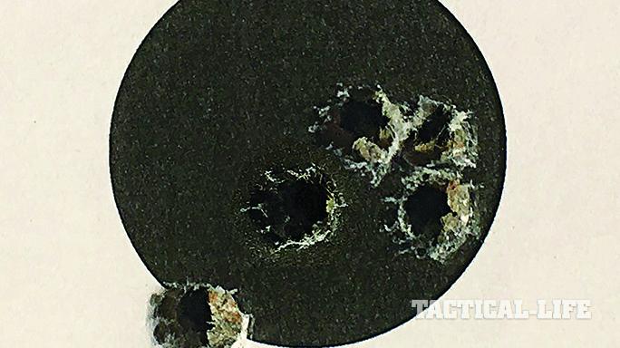Next came the 100-yard accuracy testing. The barrels are rated for sub-MOA accuracy, and I wanted to see how “sub” I could get. Shooting the BAMF from prone with a bipod and a bag rest, I received the best group with Black Hills’ remanufactured 75-grain match HP ammo, which measured 0.75 inches at 100 yards. Hornady’s 75-grain BTHPs clustered into an inch. Third place went to HPR Ammunition’s 62-grain Black Ops OTF ammo, with a 1.87-inch group.