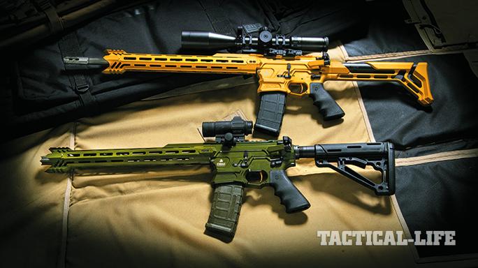 For controls, both guns feature ambidextrous, 45-degree safety selectors from KE Arms as well as Raptor ambidextrous charging handles from AXTS Weapons Systems. The ambidextrous magazine release is an extended design from Odin Works, and even the traditional thin, stamped ejection port cover has been replaced with a thickened model for another distinctive touch.