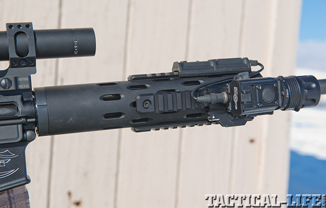 All of the testing was completed with the SureFire M720V light attached. This light allows for either white or infrared lighting and uses a remote switch that can be easily attached to any rail. It can be activated using a momentary or constant-on switch. Designed for the military as a “do all” rifle-mounted light, the M720V can also be used as a handheld light. A button on the body allows for use with or without the rail-mounted remote switch. It is easily one of the most versatile tactical lights on the market.
