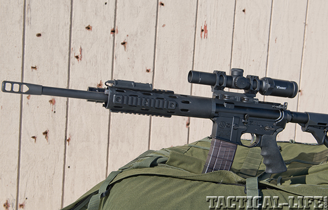 I added a Vixen Optics 1-6x24mm scope in an American Defense QD single-piece mount, which made it easy to attach and remove the scope with no loss in zero. The scope’s illuminated duplex reticle, positioned in the second focal plane, allows for better aiming at longer ranges.
