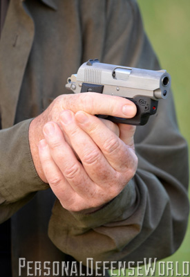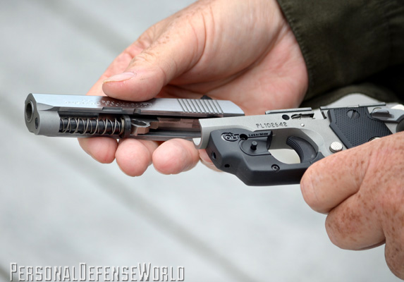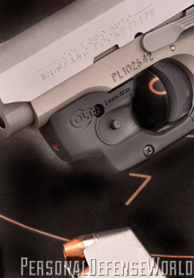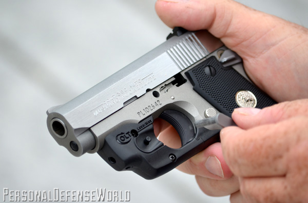 The Mustang has always been an easy gun to shoot, but the sights were never that great, and with Colt still copying the original small, ramp front sight, nothing has changed. For this test, however, it is all about the LaserMax Centerfire laser guard and what it adds to the Pocketlite’s effectiveness. The laser is easily activated by the trigger finger, which, if you follow proper technique, instinctively rests alongside the triggerguard and on the LaserMax activation button. A light press inward on the button, and the heat is on. It is also ambidextrous, so either side works.