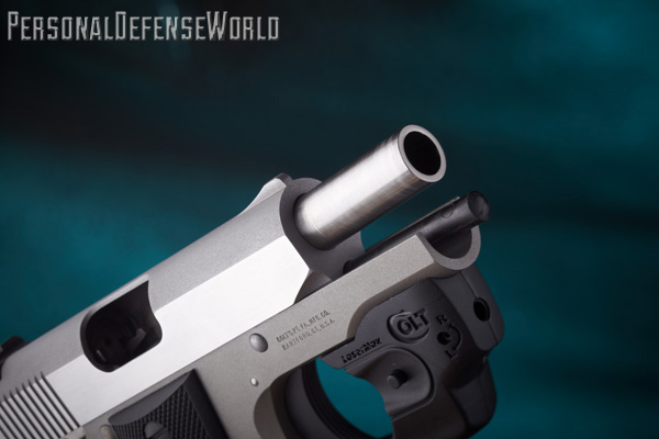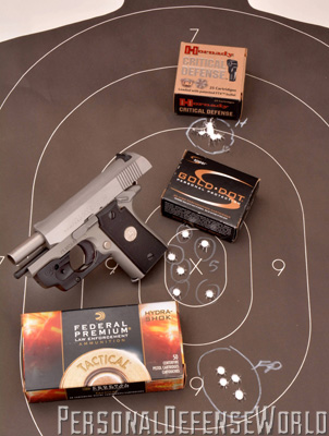All tests were done under low-light conditions (at dusk) relying solely on the LaserMax for targeting at a distance of 7 yards. Either five or six rounds were fired at one-second intervals using three popular defensive brands of ammunition. All three functioned flawlessly in the Mustang Pocketlite, and the consistent 6-pound trigger pull made easy work of timed fire. The laser painted the target clearly, and every group measured 2 inches or less. The most accurate load fired from the Colt was the Hornady Critical Defense, which placed six rounds at 0.75 inches, all overlapping just above point of aim, in the 9-ring at 12 o’clock. The second-best group, the Speer Gold Dot, landed six rounds at just under 1.5 inches. The widest group, just under 2 inches, was shot with Federal Premium.