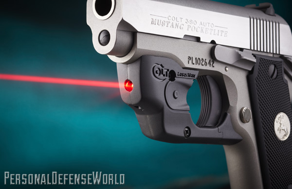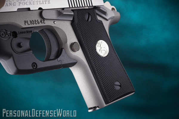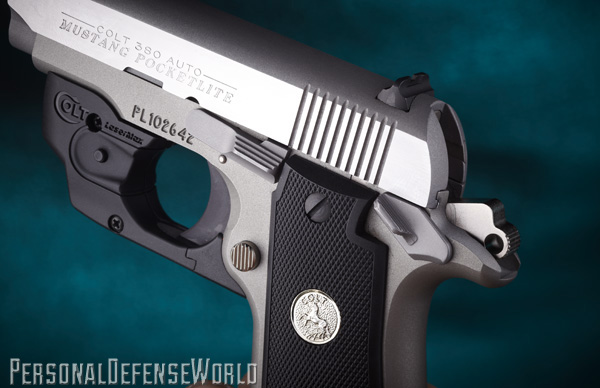 The pocketlite has a very solid feel when you grip it, more so than the .380s with a polymer frame. While this adds a little weight, that heft means the Mustang is better at recoil management. The large 1911-style thumb safety is very familiar and easy to release on the draw, and has a positive lock that you can feel and hear when its pushed upward into the locked position or thumbed down to release. If you’re accustomed to the 1911, this gun is about as intuitive to handle as they come. So here is the old-dog part of this tale. How do you take a gun that was built in the late 20th century, one based on a design established in 1911, and pull it into the 21st century? The answer is twofold. First, you build a Mustang Pocketlite that comes with a built-in laser guard (which can also be purchased separately). The result you see presented is the Colt Mustang Pocketlite with LaserMax, and this is a game changer! Second, you redesign the Mustang and built it with a polymer frame, a change that is forthcoming as the Mustang XPS.