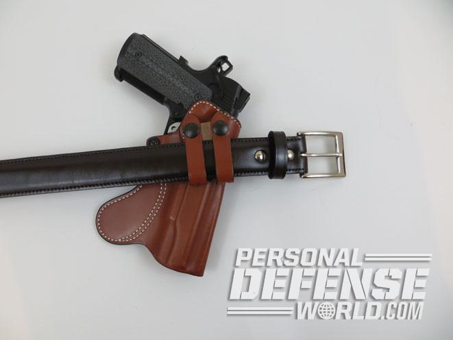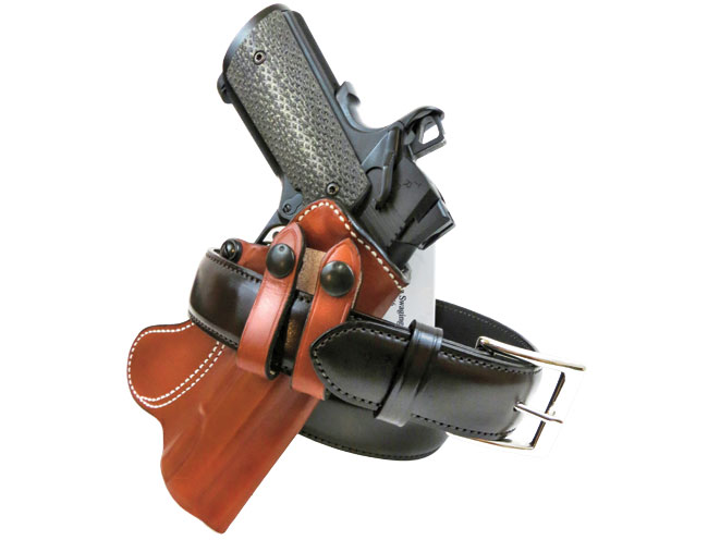 The DeSantis Inner Piece holster has long been a go-to IWB holster for 1911s. I like the leather snap loops and the old-school saddle leather. A stabilizer wing built into the back of the holster keeps a 1911 in position. I also like the reinforced mouth so I can reholster a 1911 with one hand. I use a Galco SB3 Dress Belt with the Inner Piece when I dress business casual with khakis or wool slacks. The 1.5-inch-wide Galco looks smart, and since the belt is rigid, it can carry the weight of a 1911 and look ready for the 10:00 a.m. standing meeting.
