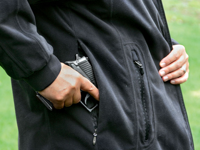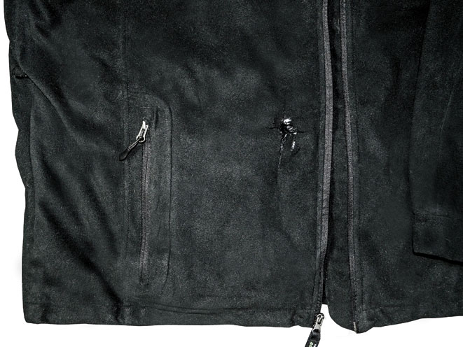 A system that combines a holster and a concealment garment is the Rivers West Full Metal Jacket. This lightweight fleece has a built-in shoulder harness that connects to a holster. The holster uses a concealed plate so it doesn’t print. There are two hand-warmer pockets, but a unique feature is that the holstered weapon is accessible via a hidden pocket. In fact, you can shoot through the garment with the weapon completely hidden. I’ve worn the Full Metal Jacket this past fall and winter carrying a Glock 17 and no one was the wiser. I’ve been told the slide won’t hang up in the garment, and the way it is constructed I’m inclined to believe them. I like the jacket so much I don’t want to shoot through it.